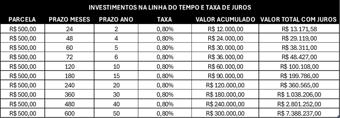 Segue abaixo uma tabela simulando investimentos mensais de R$ 300,00 por mês na linha do tempo com taxa média de rentabilidade de 0,80% ao mês e o valor final que você resgataria, considerando todo o montante poupado e reinvestido, adicionado de juros compostos: